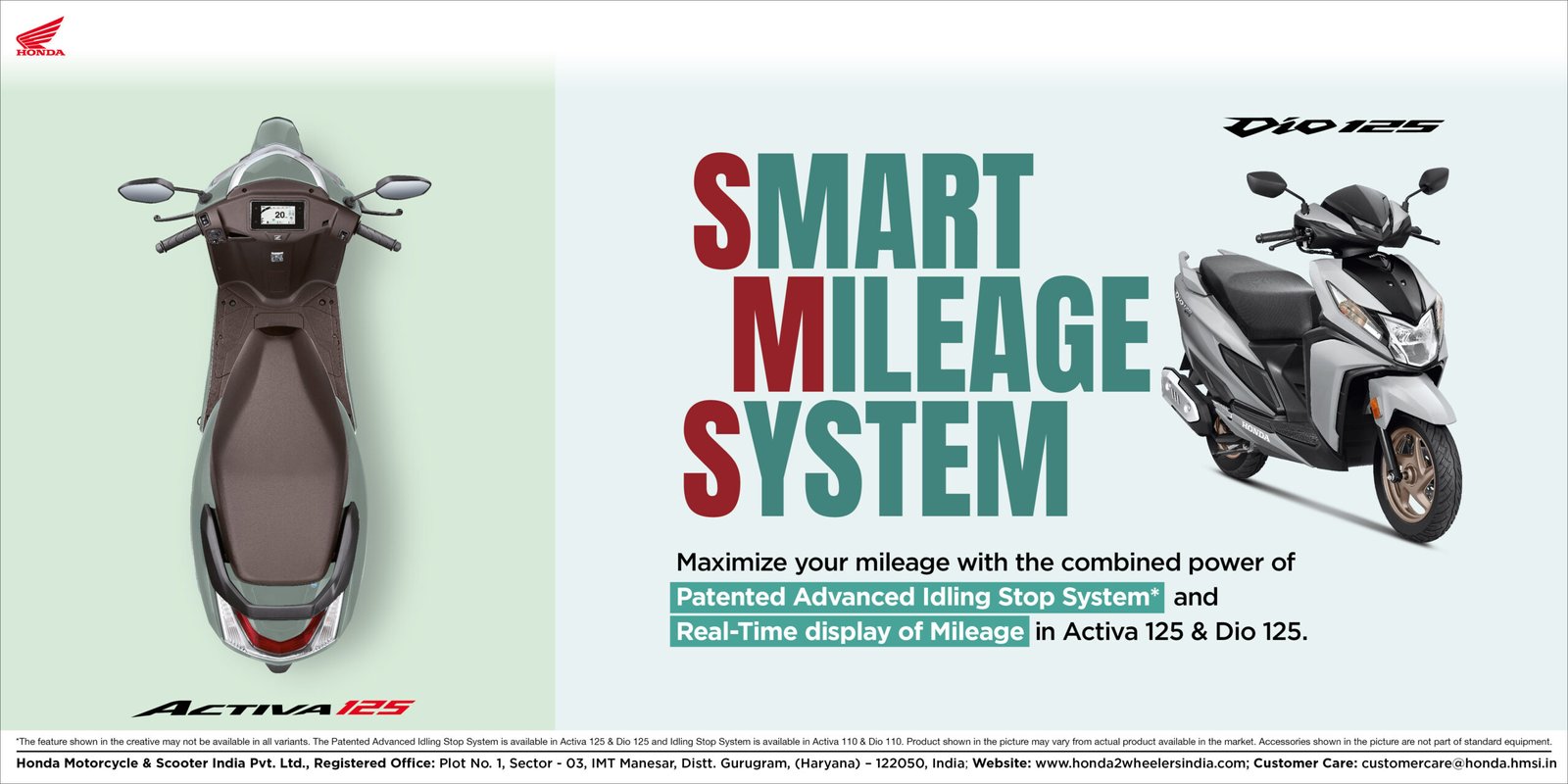 Honda’s Smart Mileage System is a combination of a Patented Advanced Idling Stop System and a Real-Time Mileage Display that improves fuel efficiency, helping riders save money by automatically turning the engine off when the scooter is stopped and displaying the current fuel economy for smarter rides. This technology is featured on models like the Honda Activa 125 and Dio 125, enhancing overall fuel efficiency and promoting a smarter way to ride.